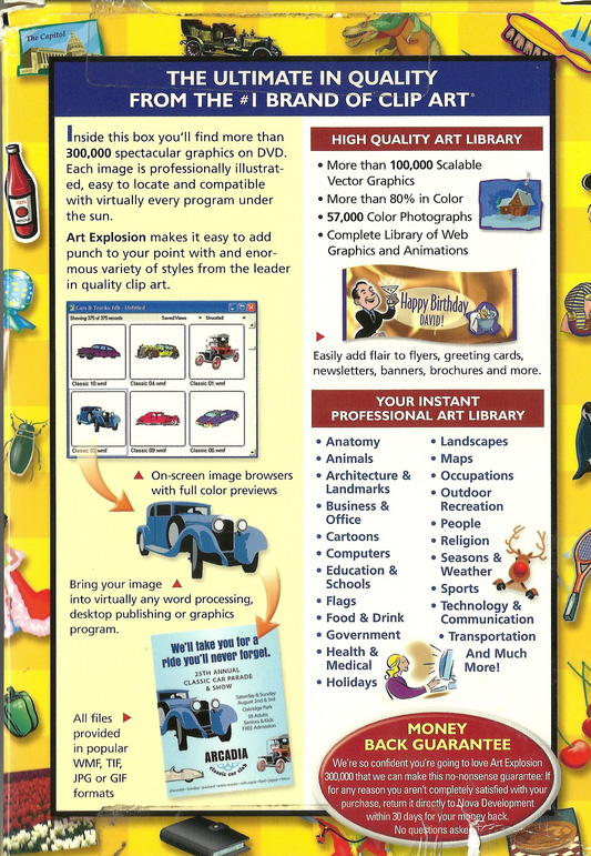 You'll find more than 300.000 spectacular graphics on DVD. Each image is professionally illustrated. easy to locate and compatible with virtually every program under the sun.