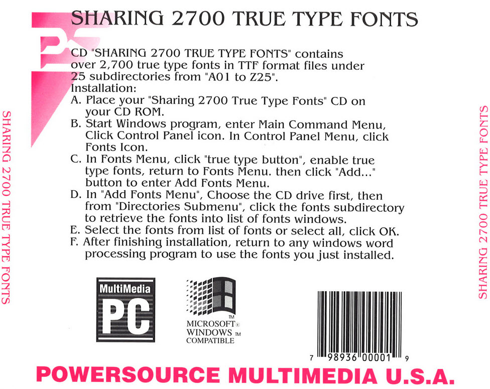 CD "SHARING 2700 TRUE TYPE FONTS” contains over 2,700 true type fonts in TTF format files under 25 subdirectories from "AO 1 to Z25”.